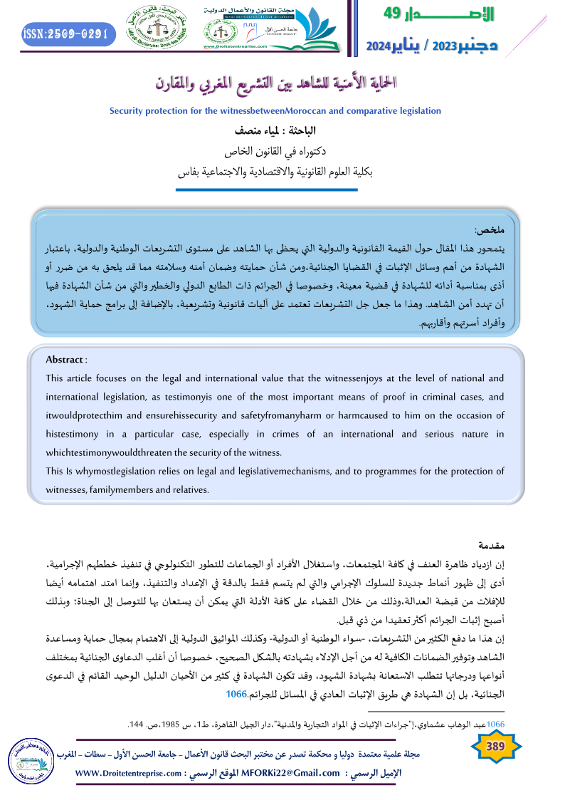 الحماية الأمنية للشاهد بين التشريع المغربي والمقارن – الباحثة : لمياء منصف