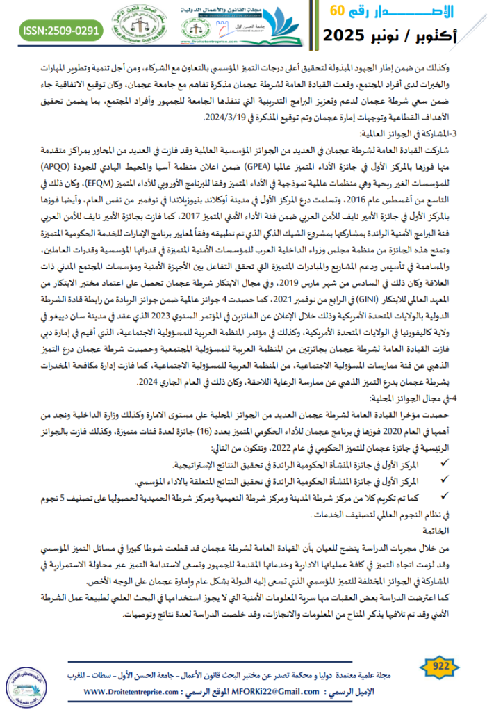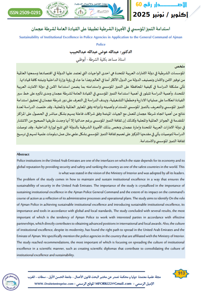 The problem of the study comes in how to maintain and sustain institutional excellence in a way that ensures the sustainability of security in the United Arab Emirates. The importance of the study is crystallized in the importance of sustaining institutional excellence in the Ajman Police General Command and the extent of its impact on the command’s course of action as a reflection of its administrative processes and operational plans. The study aims to identify On the role of Ajman Police in achieving sustainable institutional excellence and introducing sustainable institutional excellence, its importance and tools in accordance with global and local standards, The study concluded with several results, the most important of which is the tendency of Ajman Police to work with interested parties in accordance with effective partnerships, which directly contributes to obtaining advanced positions in international and local awards. Also, the culture of institutional excellence, despite its modernity, has found the right path to spread in the United Arab Emirates and the Emirate of Ajman. We specifically mention the police agencies in the country that are affiliated with the Ministry of Interior. The study reached recommendations, the most important of which is focusing on spreading the culture of institutional excellence in a scientific manner, such as creating scientific diplomas that contribute to consolidating the culture of institutional excellence and sustainability.