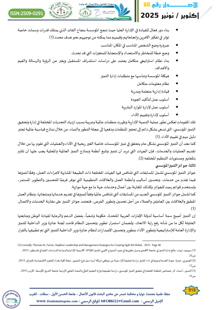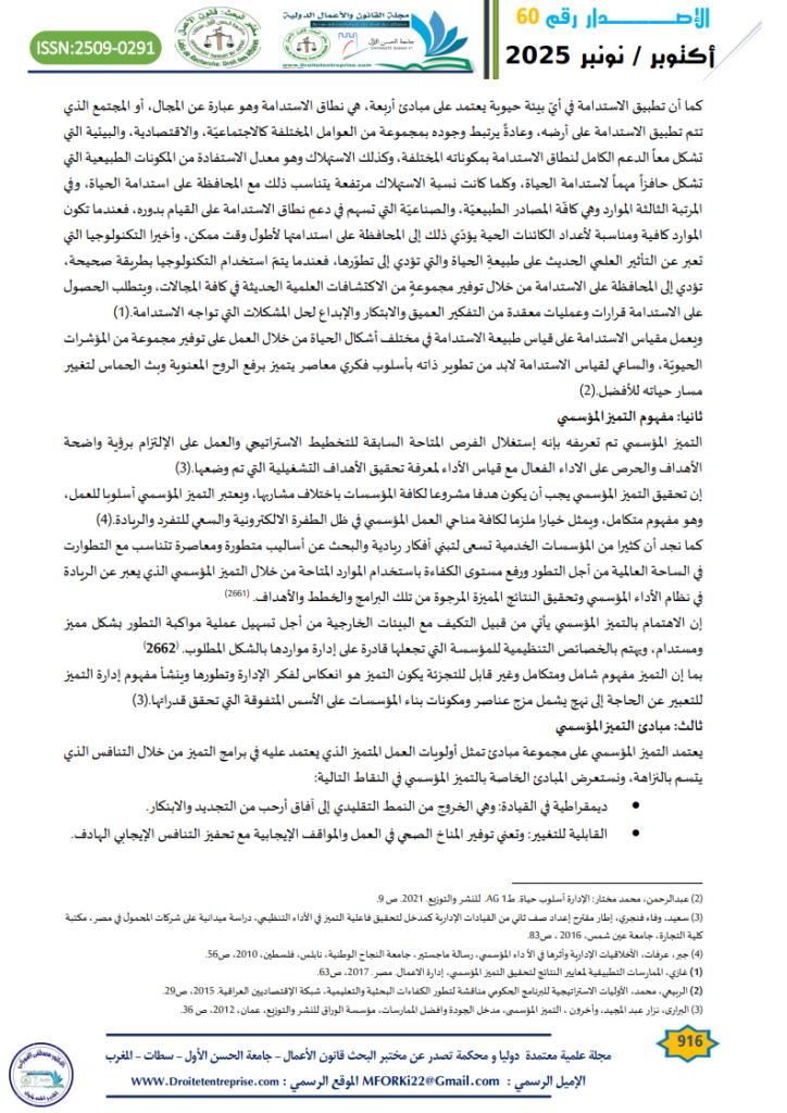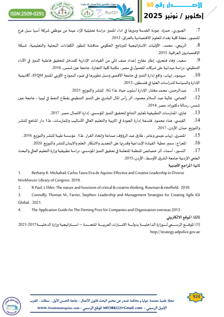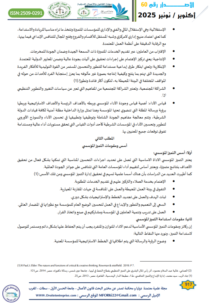 - (1) باشيوة، عبدالله والبرواري، عبد المجيد وعيشوني، أحمد، التميز المؤسسي مدخل الجودة وأفضل الممارسات مبادئ وتطبيقات، ط1 ،عمان، مؤسسة الوراق للنشر والتوزيع، 2016، ص52. ↑