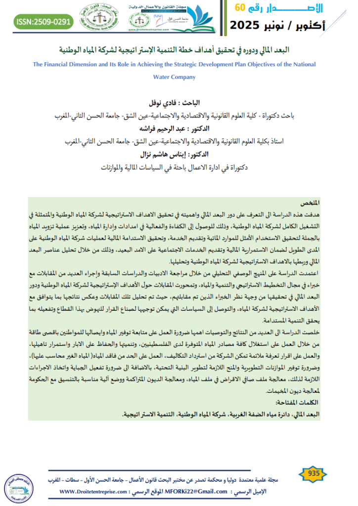 البعد المالي ودوره في تحقيق أهداف خطة التنمية الإستراتيجية لشركة المياه الوطنية – الباحث : فادي نوفل – الدكتور : عبد الرحيم فراشه – الدكتور: إيناس هاشم نزال