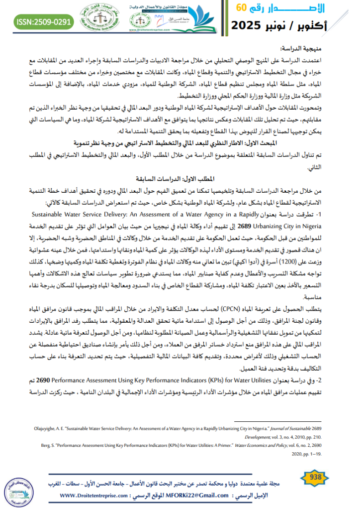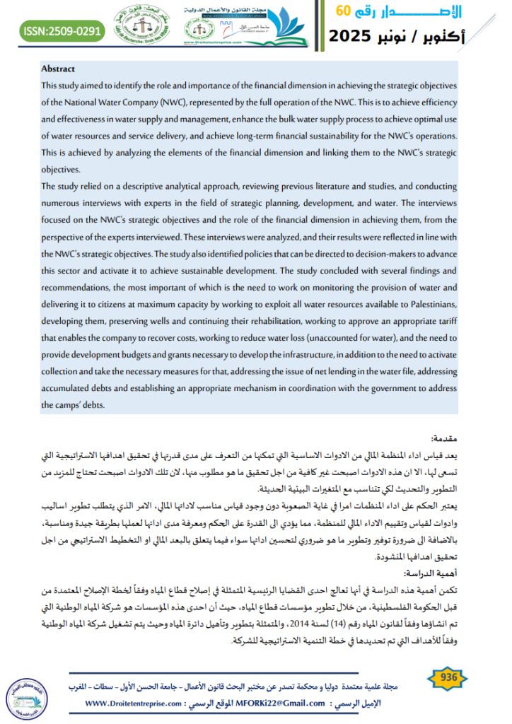 This study aimed to identify the role and importance of the financial dimension in achieving the strategic objectives of the National Water Company (NWC), represented by the full operation of the NWC. This is to achieve efficiency and effectiveness in water supply and management, enhance the bulk water supply process to achieve optimal use of water resources and service delivery, and achieve long-term financial sustainability for the NWC’s operations. This is achieved by analyzing the elements of the financial dimension and linking them to the NWC’s strategic objectives.