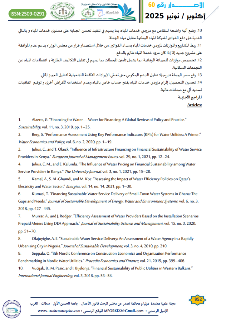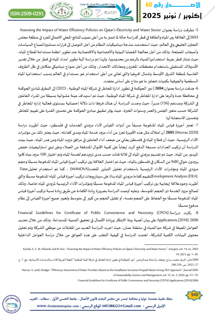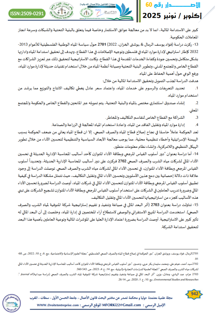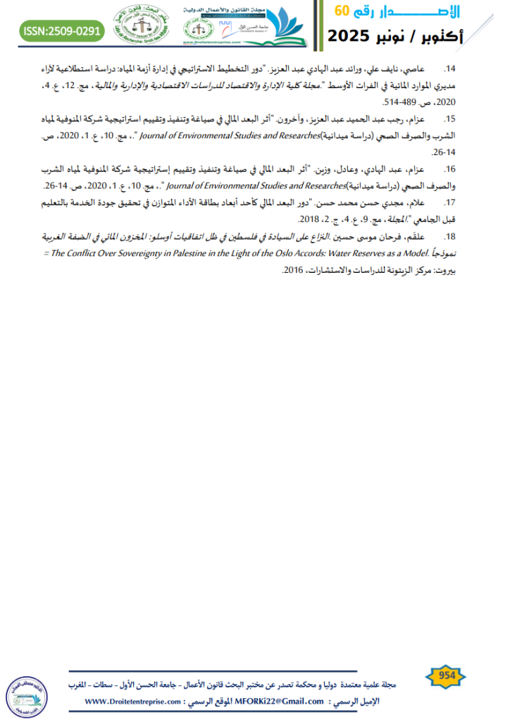 - الرمال، فؤاد يوسف، وبوشتى الخزان. “دور الحوكمة في إصلاح قطاع المياه والصرف الصحي الفلسطيني.” مجلة العلوم الإنسانية والاجتماعية، مج. 6، ع. 10، 2022، ص. 68-91.