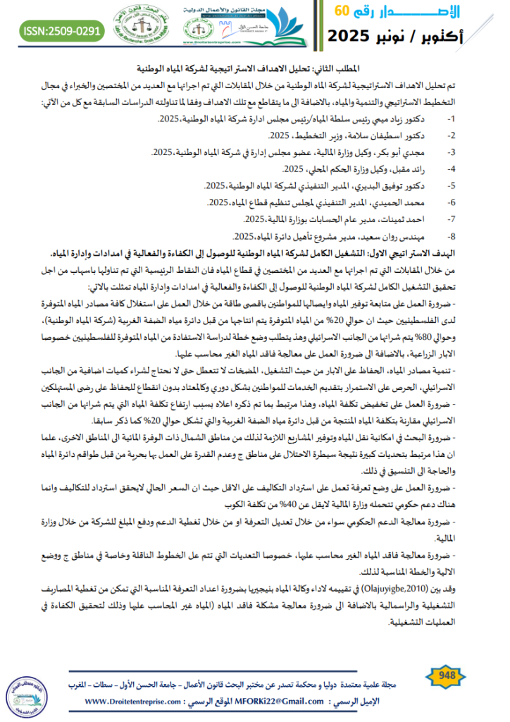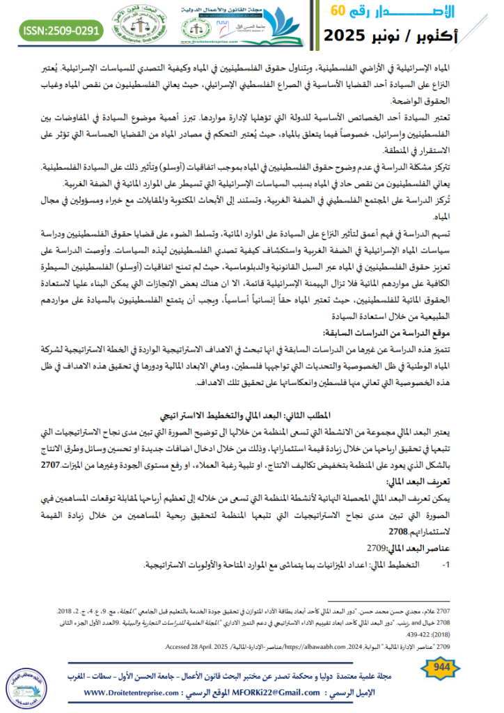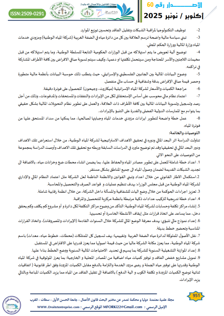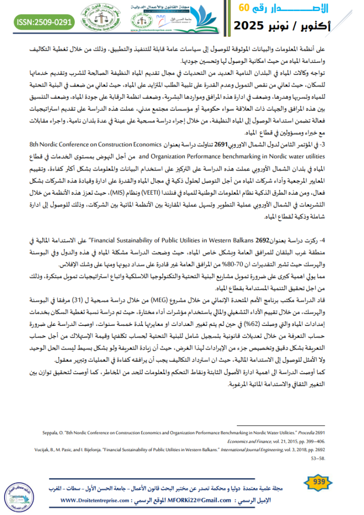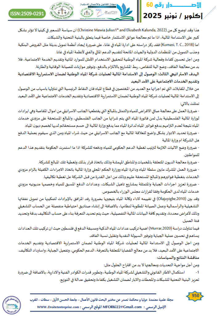 - الرمال، فؤاد يوسف، وبوشتى الخزان. “دور الحوكمة في إصلاح قطاع المياه والصرف الصحي الفلسطيني.” مجلة العلوم الإنسانية والاجتماعية، مج. 6، ع. 10، 2022، ص. 68-91.