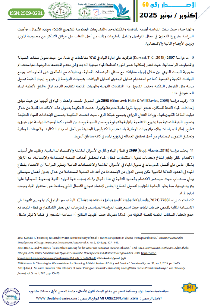 9- أما دراسة [9] Kumasi, T. C. ,2018)) فركزت على ادارة المياه في ثلاثة مقاطعات في غانا، من حيث تمويل نفقات الصيانة والمصاريف الرأسمالية، حيث تعتبر إشكالية نقص الموارد لأنظمة المياه صغيرة الحجم والتي تخدم المجتمعات الريفية، تم استخدام منهجية البحث النوعي من خلال إجراء مقابلات مع ممثلي المجتمعات المحلية، ومقابلات مع المطلعين على المعلومات، وجمع البيانات الكمية والنوعية. كما تم استخدام تحليل المحتوى لتحليل البيانات، وتوصلت الدراسة إلى ضرورة إيجاد أنظمة تمويل بديلة مثل القروض البنكية وجذب التمويل من المنظمات الدولية والجهات المانحة لتقديم الدعم المالي والفني لأنظمة المياه الصغيرة في غانا.