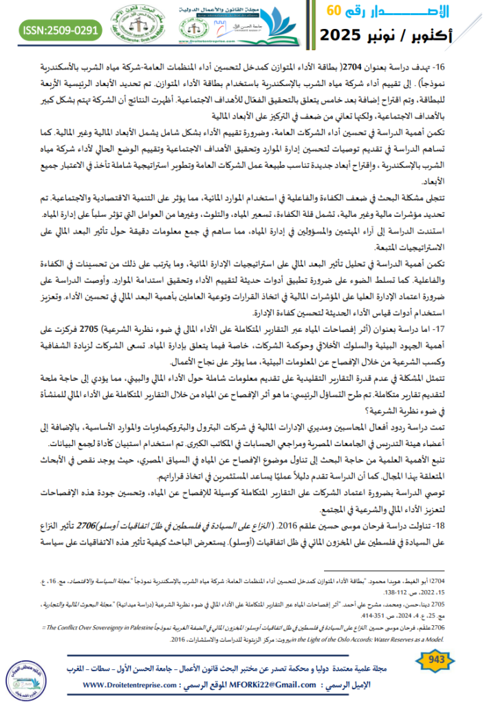 - دينا،حسن، ومحمد، مشرح علي أحمد. “أثر إفصاحات المياه عبر التقارير المتكاملة على الأداء المالي في ضوء نظرية الشرعية (دراسة ميدانية).” مجلة البحوث المالية والتجارية، مج. 25، ع. 4، 2024، ص. 351-414. ↑
