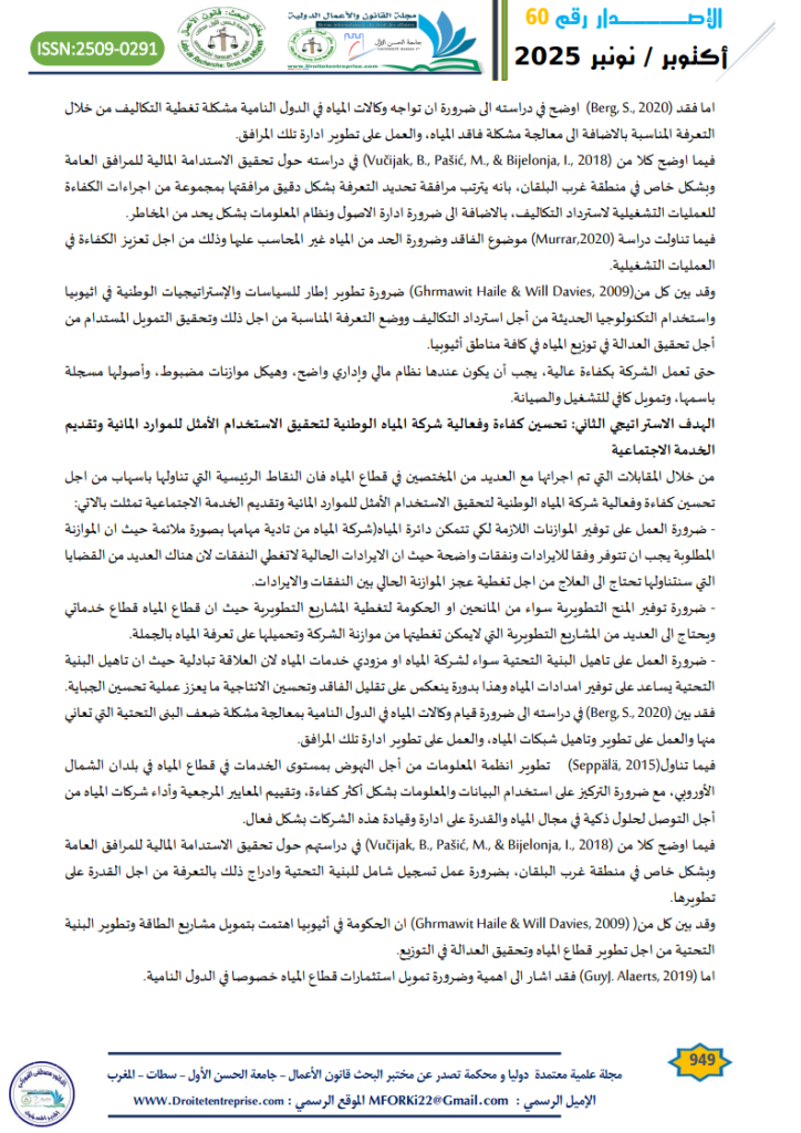 11- بحثت دراسة GuyJ. Alaerts ,2019)) [11] في قطاع المياه والمال في الأسواق الناشئة والإقتصادات النامية، وركزت على أسباب الانعدام المائي وتغير المناخ وتحديات تمويل استثمارات قطاع المياه لتحقيق أهداف التنمية المستدامة والإنسانية، مع التركيز بشكل خاص على أفضل الممارسات في تمويل المياه في الأسواق الناشئة والاقتصادات النامية. وتظهر الدراسة أن الاهتمام بقطاع المياه في العقود الثلاثة الماضية مكن بعض الدول من الإستفادة من أهداف التنمية المستدامة من خلال جدول أعمال سياساتي ومالي مستدام، حيث سيستمر الاهتمام بالعقود التالية في هذا المجال وذلك بسبب ندرة الموارد المائية وصعوبة السيطرة عليها وتزايد قيمتها، مما يظهر الحاجة المتزايدة لتمويل القطاع الخاص لإعتماد نموذج الأعمال الذي يحافظ على استقرار المياه وجودة إدارة المياه.