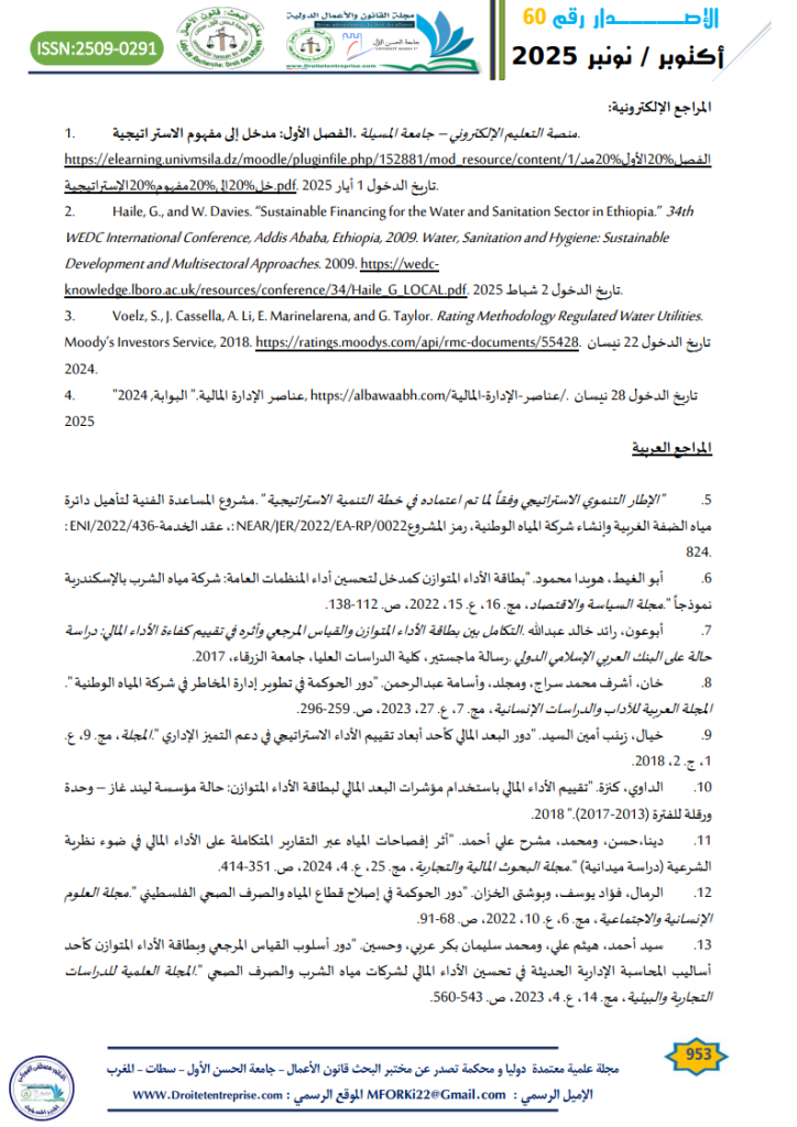 - عزام، عبد الهادي، وعادل، وزين. “أثر البعد المالي في صياغة وتنفيذ وتقييم إستراتيجية شركة المنوفية لمياه الشرب والصرف الصحي (دراسة ميدانية).” Journal of Environmental Studies and Researches، مج. 10، ع. 1، 2020، ص. 14-26. ↑
