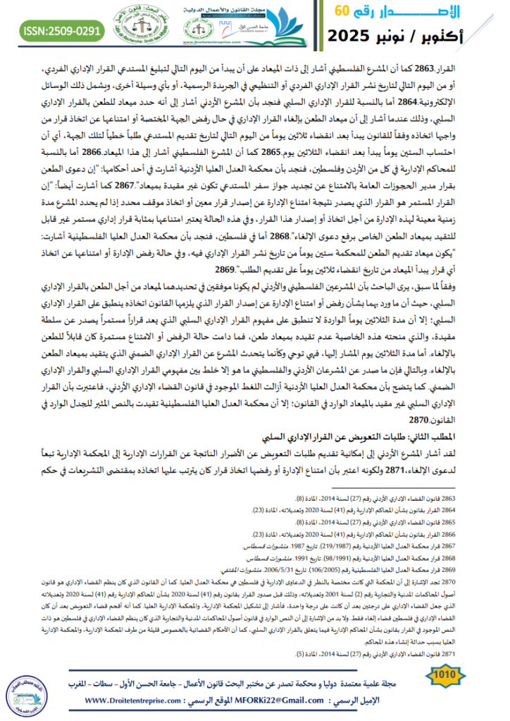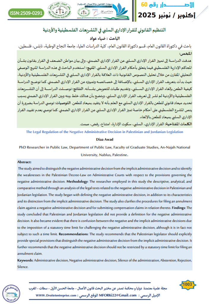 The study aimed to distinguish the negative administrative decision from the implicit administrative decision and to identify the weaknesses in the Palestinian Decree-Law on Administrative Courts with respect to the provisions governing the negative administrative decision. Methodology: The researcher employed in this study the descriptive, analytical, and comparative method through an analysis of the legal texts related to the negative administrative decision in Palestinian and Jordanian legislation. The study began with defining the negative administrative decision, in addition to its characteristics and its distinction from the implicit administrative decision. The study also clarifies the procedures for filing an annulment claim against a negative administrative decision and for submitting compensation claims in relation thereto. Findings: The study concluded that Palestinian and Jordanian legislation did not provide a definition for the negative administrative decision. It also became evident that there is confusion between the negative and the implicit administrative decisions due to the imposition of a statutory time limit for challenging the negative administrative decision, although it is in fact not subject to such a time limit. Recommendations: The study recommends that the Palestinian legislator should explicitly provide special provisions that distinguish the negative administrative decision from the implicit administrative decision. It further recommends that the negative administrative decision should not be restricted by a statutory time limit for filing an annulment claim.