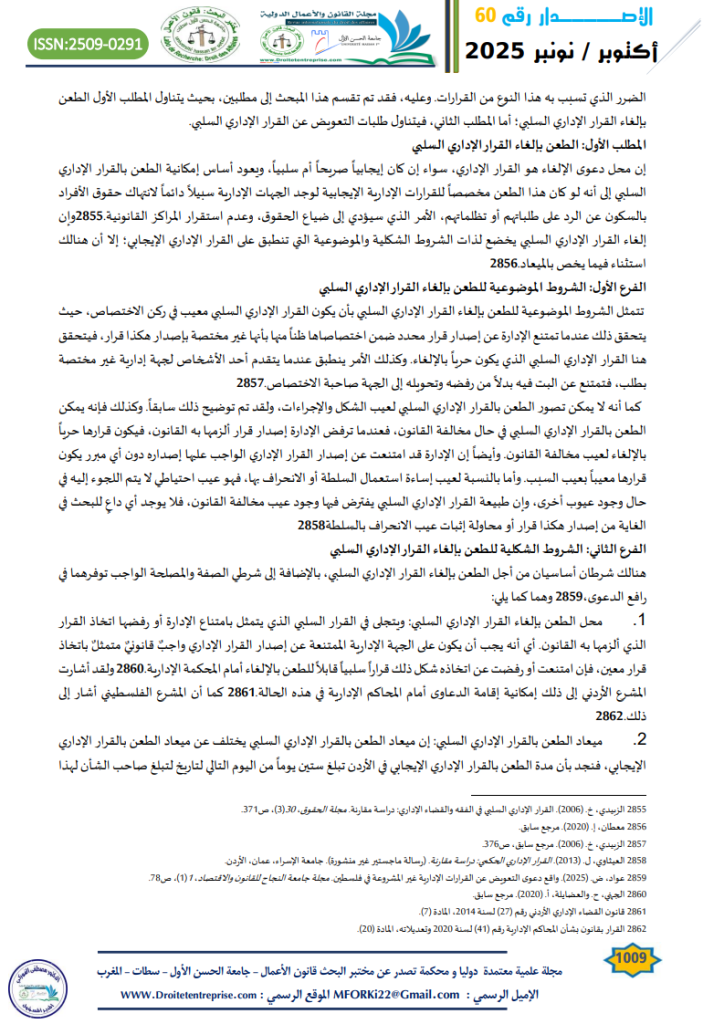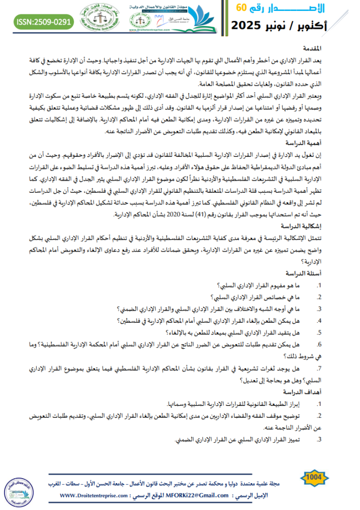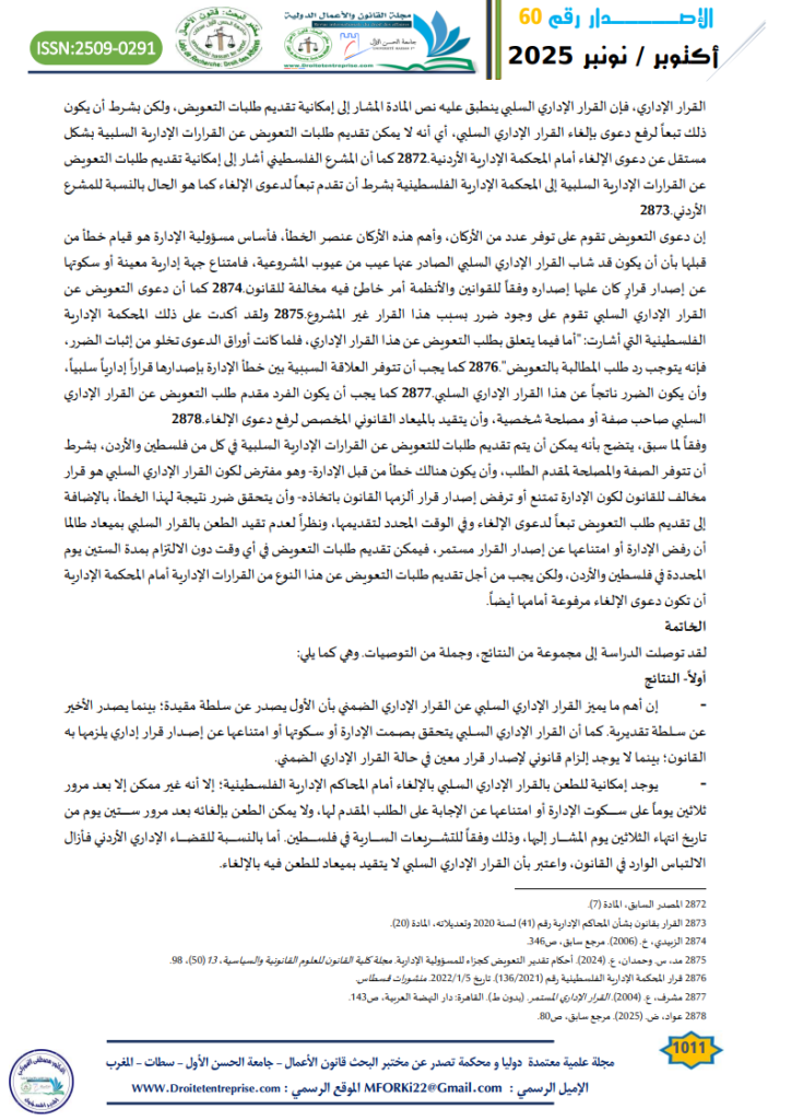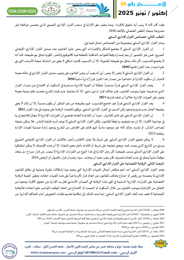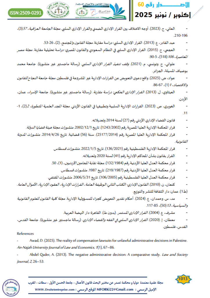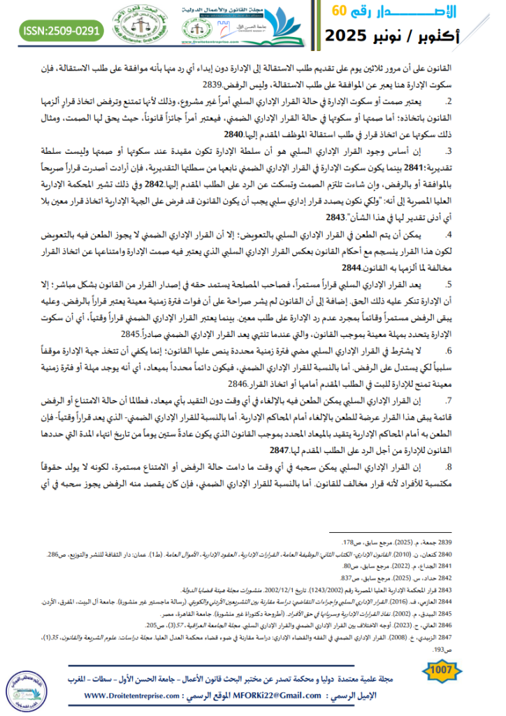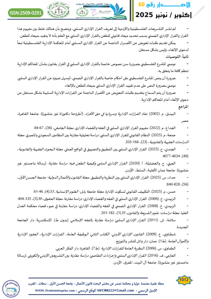 - حداد، س. (2025). القرار الإداري السلبي بين النظرية والتطبيق. مجلة القانون والأعمال الدولية- جامعة الحسن الأول، (56)، ص832. ↑
