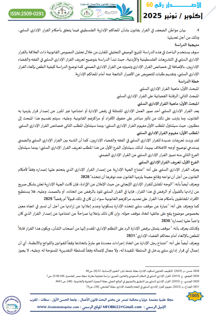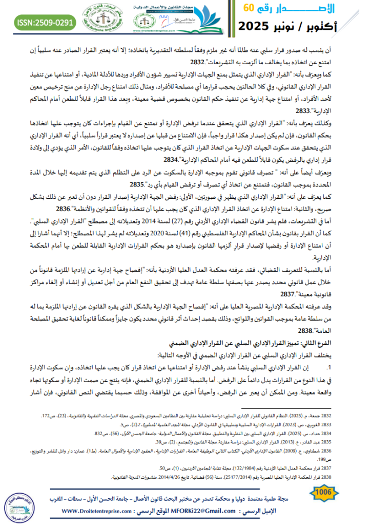 - الجندي، ح. (2025). القرار الإداري السلبي بين التطبيق والتضييق في الواقع العملي. مجلة البحوث الفقهية والقانونية، (49)، ص 4043. ↑