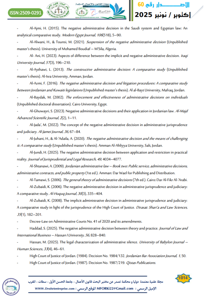 - Haddad, S. (2025). The negative administrative decision between theory and practice. Journal of Law and International Business – Hassan I University, 56, 828–840.
