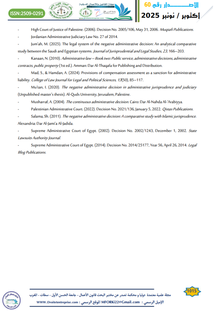 - Jum‘ah, M. (2025). The legal system of the negative administrative decision: An analytical comparative study between the Saudi and Egyptian systems. Journal of Jurisprudential and Legal Studies, 23, 166–203.