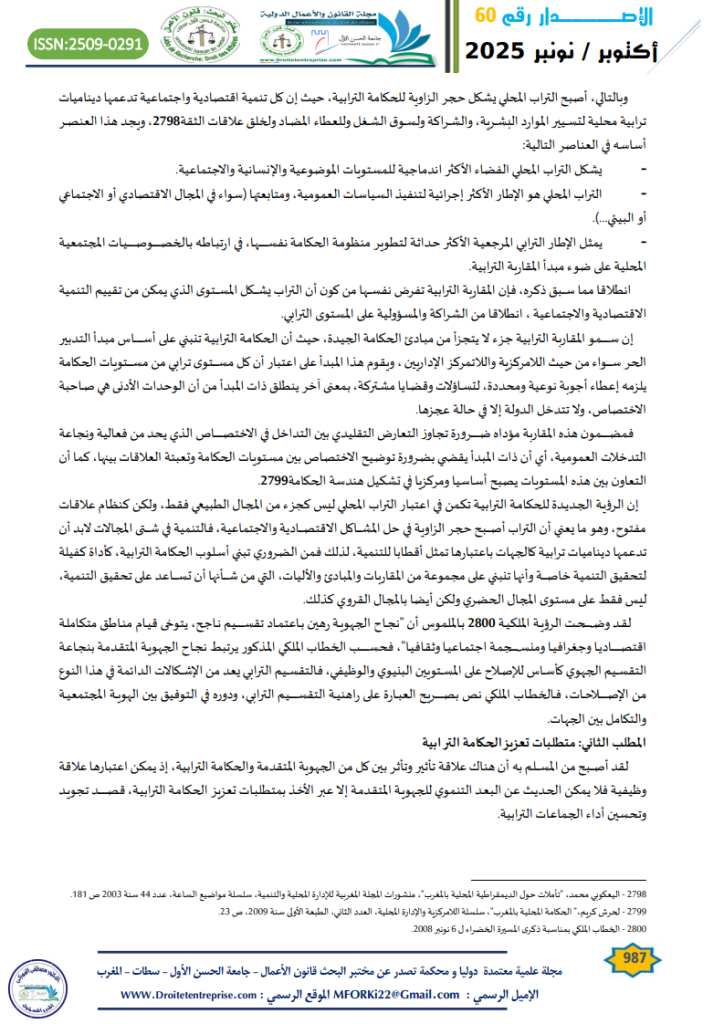 - يمثل الإطار الترابي المرجعية الأكثر حداثة لتطوير منظومة الحكامة نفسها، في ارتباطه بالخصوصيات المجتمعية المحلية على ضوء مبدأ المقاربة الترابية.