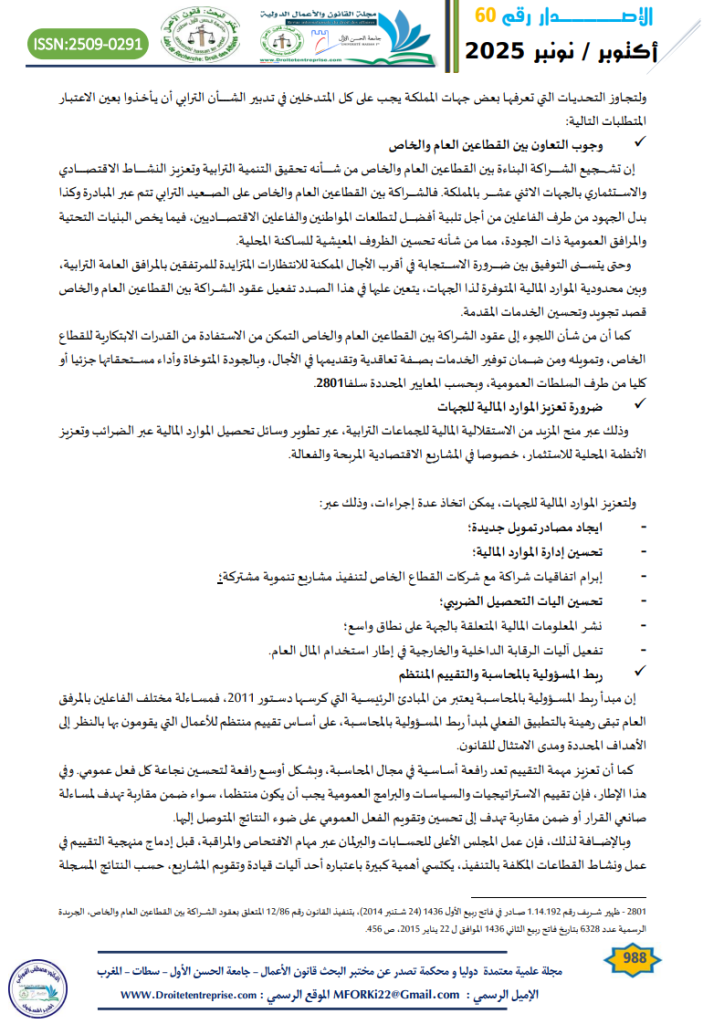 وحتى يتسنى التوفيق بين ضرورة الاستجابة في أقرب الأجال الممكنة للانتظارات المتزايدة للمرتفقين بالمرافق العامة الترابية، وبين محدودية الموارد المالية المتوفرة لذا الجهات، يتعين عليها في هذا الصدد تفعيل عقود الشراكة بين القطاعين العام والخاص قصد تجويد وتحسين الخدمات المقدمة.