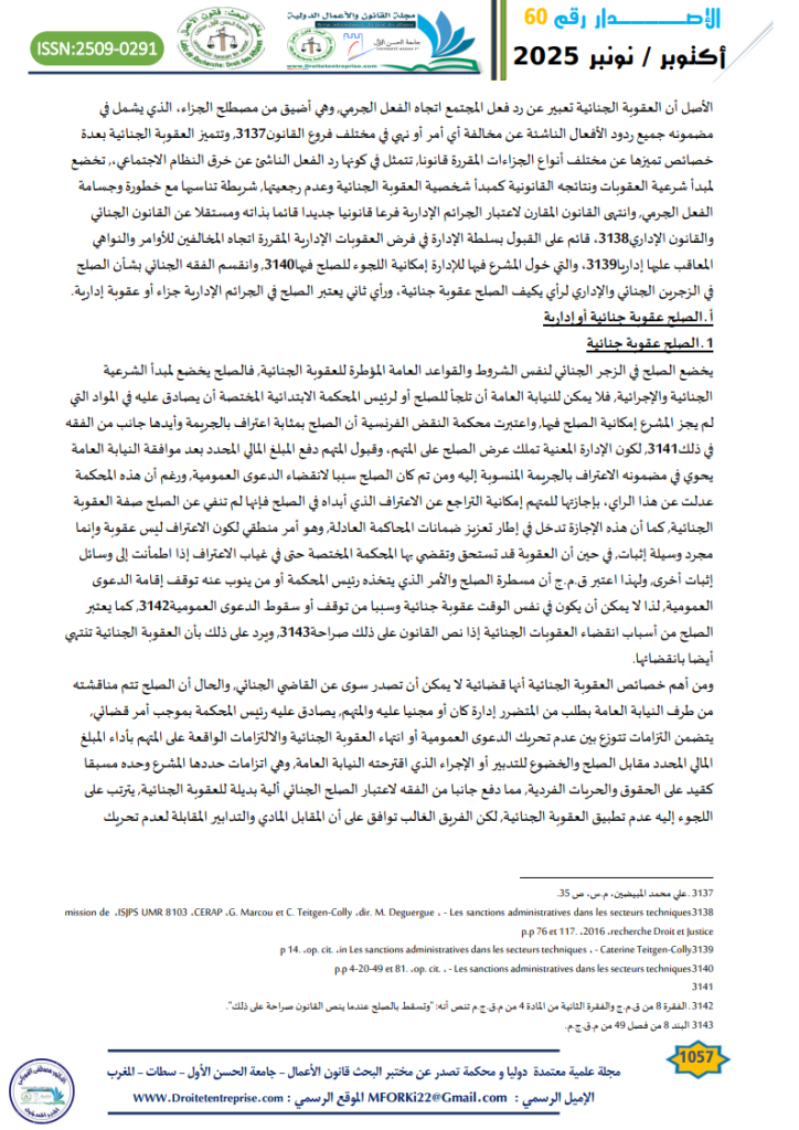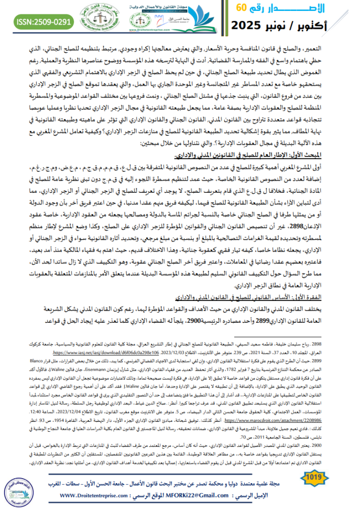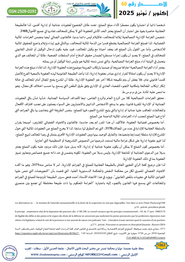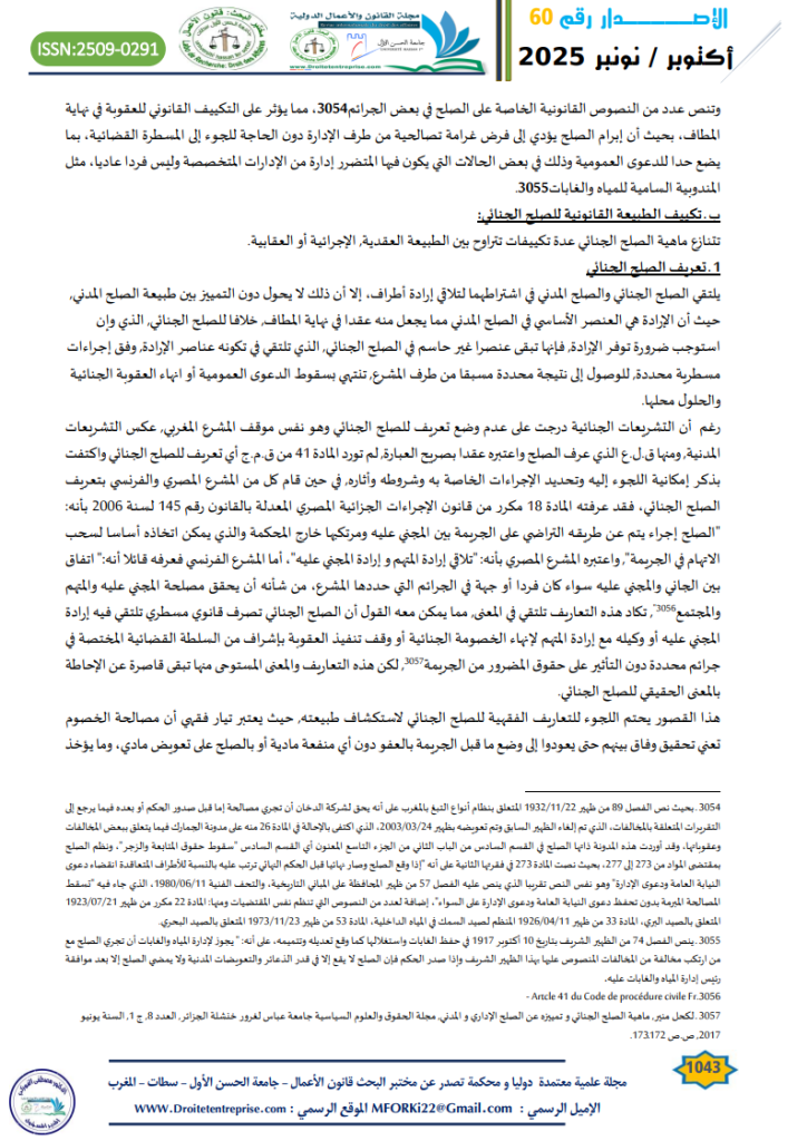 274. ـ لكحل منير، ماهية الصلح الجنائي، تمييزه عن الصلح الإداري، المدني، مجلة الحقوق، العلوم الإنسانية، كلية الحقوق، العلوم السياسية جامعة عباس لغرور خنشلة، العدد 8 الجزء 1، يوني، 2017، ص 181. متوفر على الأنترنيت، https://www.asjp.cerist.dz.