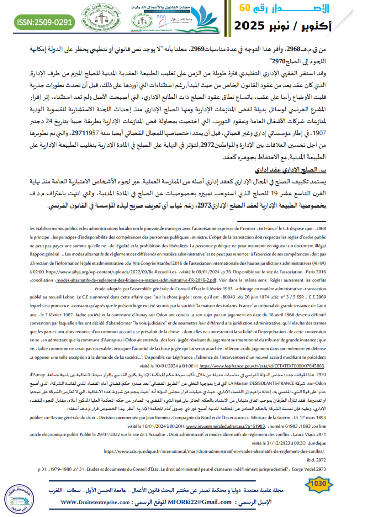 يستمد تكييف الصلح في المجال الإداري كعقد إداري أصله من الممارسة العملية, عبر لجوء الأشخاص الاعتبارية العامة منذ نهاية القرن التاسع عشر 19 للصلح الذي استوجب تمييزه بخصوصيات عن الصلح في المادة المدنية، والتي انتهت باعتراف م.د.ف بخصوصية الطبيعة الإدارية لعقد الصلح الإداري[95]، رغم غياب أي تعريف صريح لهذه المؤسسة في القانون الفرنسي.
