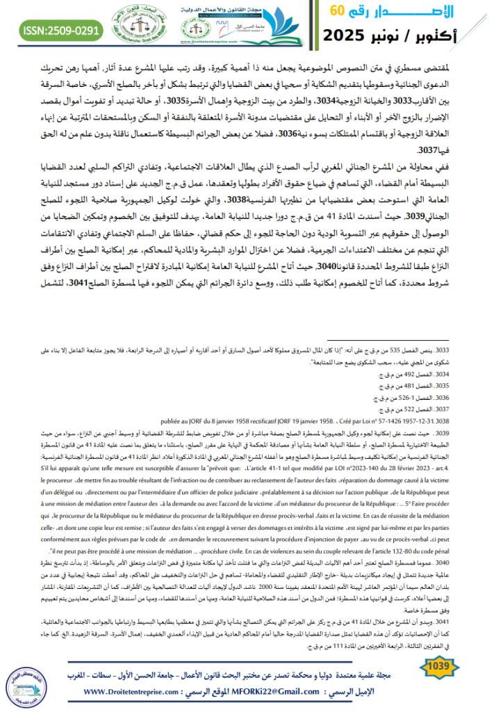 ففي محاولة من المشرع الجنائي المغربي لرأب الصدع الذي يطال العلاقات الاجتماعية، وتفادي التراكم السلبي لعدد القضايا البسيطة أمام القضاء، التي تساهم في ضياع حقوق الأفراد بطولها وتعقدها، عمل ق.م.ج الجديد على إسناد دور مستجد للنيابة العامة التي استوحت بعض مقتضياتها من نظيرتها الفرنسية[160]، والتي خولت لوكيل الجمهورية صلاحية اللجوء للصلح الجنائي[161], حيث أسندت المادة 41 من ق.م.ج دورا جديدا للنيابة العامة، يهدف للتوفيق بين الخصوم وتمكين الضحايا من الوصول إلى حقوقهم عبر التسوية الودية دون الحاجة للجوء إلى حكم قضائي، حفاظا على السلم الاجتماعي وتفادي الانتقامات التي تنجم عن مختلف الاعتداءات الجرمية، فضلا عن اختزال الموارد البشرية والمادية للمحاكم، عبر إمكانية الصلح بين أطراف النزاع طبقا للشروط المحددة قانونا[162], حيث أتاح المشرع للنيابة العامة إمكانية المبادرة لاقتراح الصلح بين أطراف النزاع وفق شروط محددة، كما أتاح للخصوم إمكانية طلب ذلك، ووسع دائرة الجرائم التي يمكن اللجوء فيها لمسطرة الصلح[163]، لتشمل مختلف الجرائم المعاقب عليها بسنتين حبسا أو أقل أو بغرامة لا يتجاوز حدها الأقصى 5000 درهم[164]، لكن المشرع بتوسيع هذه الدائرة، فتح الباب على مصراعيه للصلح في بعض الجرائم التي تمس بالنظام العام والآداب العامة، والتي تشكل خطورة على المجتمع من حيث الأمن والصحة العامة والتي توصي السياسات الجنائية المعاصرة بالتشدد في فيها لمساسها بمصالح حيوية للمجتمع، من شأن التوسع في فتح الصلح بشأنها أن يؤدي للاستهانة بآثارها الوخيمة على المجتمع, كما أن جانبا من الفقه الجنائي يعتبر أن تحديد الجرائم الخاضعة لمسطرة الصلح تم بطريقة غير موضوعية، عبر حصر المعيار في المدة الحبسية ومبلغ الغرامة فقط، لكون هذا المعيار يشمل جرائم قد لا تضر بالأشخاص ولكنها تضر بالمصالح العامة، مما يستوجب ضرورة تدخل المشرع لتدارك هذا العيب التشريعي، ويعيب فريق أخر اشتراط موافقة وكيل الملك على محضر الصلح، مطالبين بإلغائها، لكننا نعتقد أن هذه الموافقة ضرورية لتفادي الأثار السلبية للجوء الألي للصلح في الجرائم الماسة بعناصر الأمن والنظام العام, خاصة الصحة العامة والسكينة العامة والي بدأت تتفاقم في المجتمع نتيجة تساهل النيابة العامة مع هذه السلوكيات الجرمية اللاحضرية.