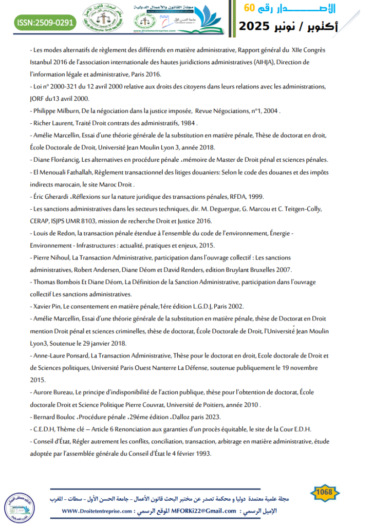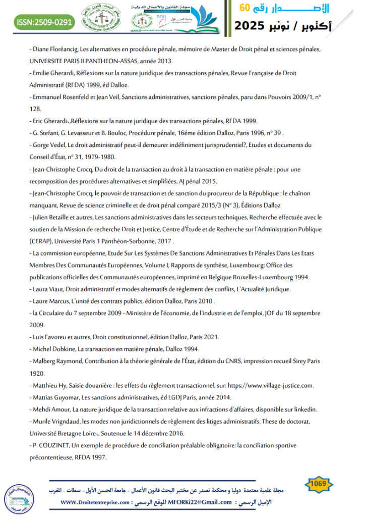 – Emilie Gherardi، Réflexions sur la nature juridique des transactions pénales، Revue Française de Droit Administratif (RFDA) 1999 Dalloz، p 905. Voir aussi: – Anne-Laure Ponsard، la transaction administrative، thèse précitée، p 40.