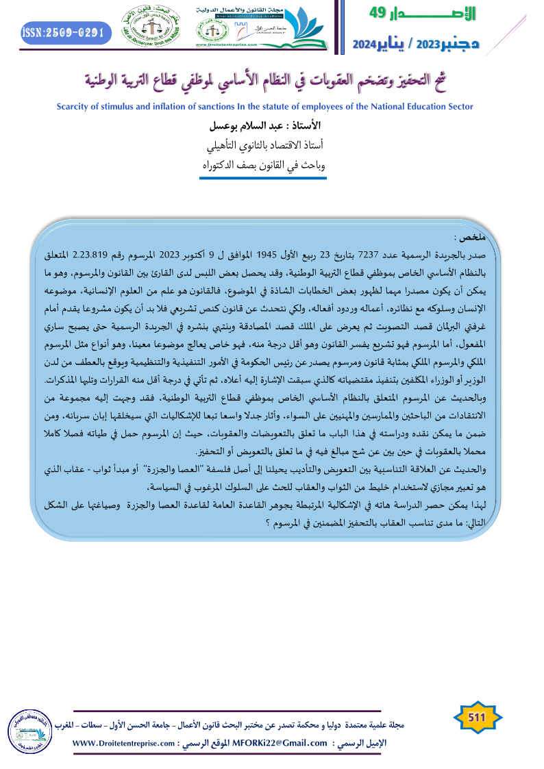 شح التحفيز وتضخم العقوبات في النظام الأساسي لموظفي قطاع التربية الوطنية الأستاذ : عبد السلام بوعسل