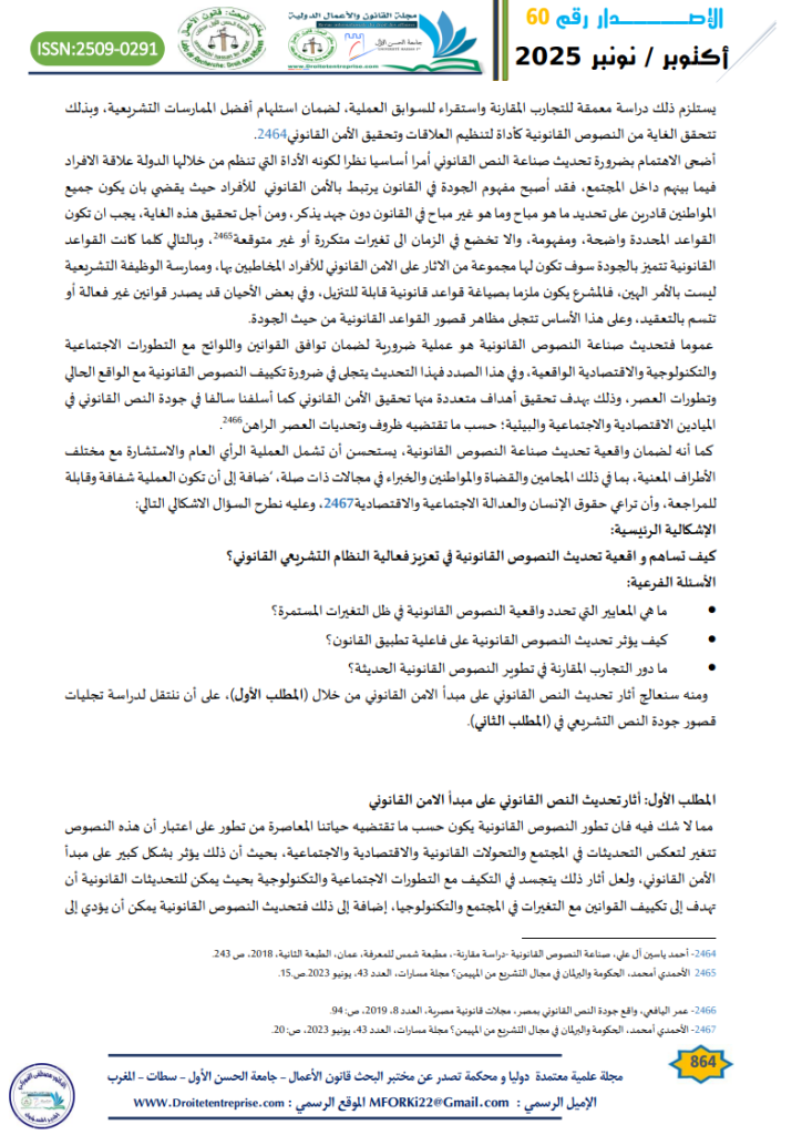 ومنه سنعالج أثار تحديث النص القانوني على مبداْ الامن القانوني من خلال (المطلب الأول)، على أن ننتقل لدراسة تجليات قصور جودة النص التشريعي في (المطلب الثاني).