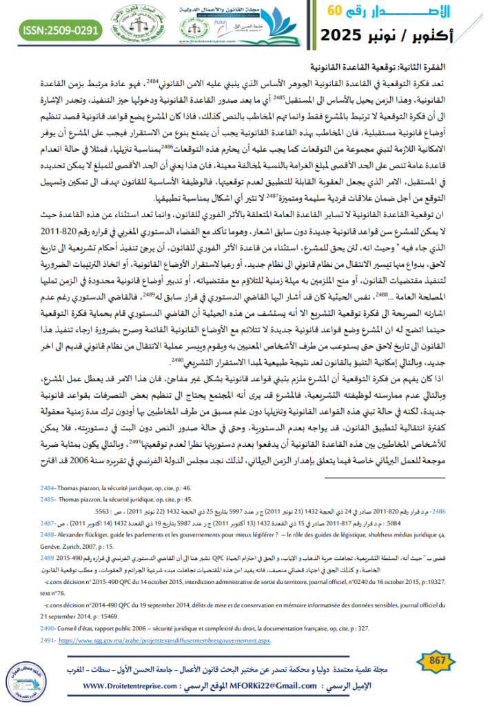 ان توقعية القاعدة القانونية لا تساير القاعدة العامة المتعلقة بالأثر الفوري للقانون، وانما تعد استثناء عن هذه القاعدة حيث لا يمكن للمشرع سن قواعد قانونية جديدة دون سابق اشعار، وهوما تأكد مع القضاء الدستوري المغربي في قراره رقم 820-2011 الذي جاء فيه ” وحيث انه، لئن يحق للمشرع، استثناء من قاعدة الأثر الفوري للقانون، اْن يرجئ تنفيذ اْحكام تشريعية الى تاريخ لاحق، بدواع منها تيسير الانتقال من نظام قانوني الى نظام جديد، اْو رعيا لاستقرار الأوضاع القانونية، اْو اتخاذ الترتيبات الضرورية لتنفيذ مقتضيات القانون، اْو منح الملزمين به مهلة زمنية للتلاؤم مع مقتضياته، اْو تدبير اْوضاع قانونية محدودة في الزمن تمليها المصلحة العامة …[25]، نفس الحيثية كان قد اْشار اليها القاضي الدستوري في قرار سابق له[26]، فالقاضي الدستوري رغم عدم اشارته الصريحة الى فكرة توقعية التشريع الا اْنه يستشف من هذه الحيثية اْن القاضي الدستوري قام بحماية فكرة التوقعية حينما اتضح له ان المشرع وضع قواعد قانونية جديدة لا تتلائم مع الأوضاع القانونية القائمة وصرح بضرورة ارجاء تنفيذ هذا القانون الى تاريخ لاحق حتى يستوعب من طرف الأشخاص المعنيين به ويقوم وييسر عملية الانتقال من نظام قانوني قديم الى اخر جديد، وبالتالي إمكانية التنبؤ بالقانون تعد نتيجة طبيعية لمبدا الاستقرار التشريعي[27].