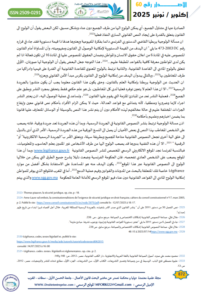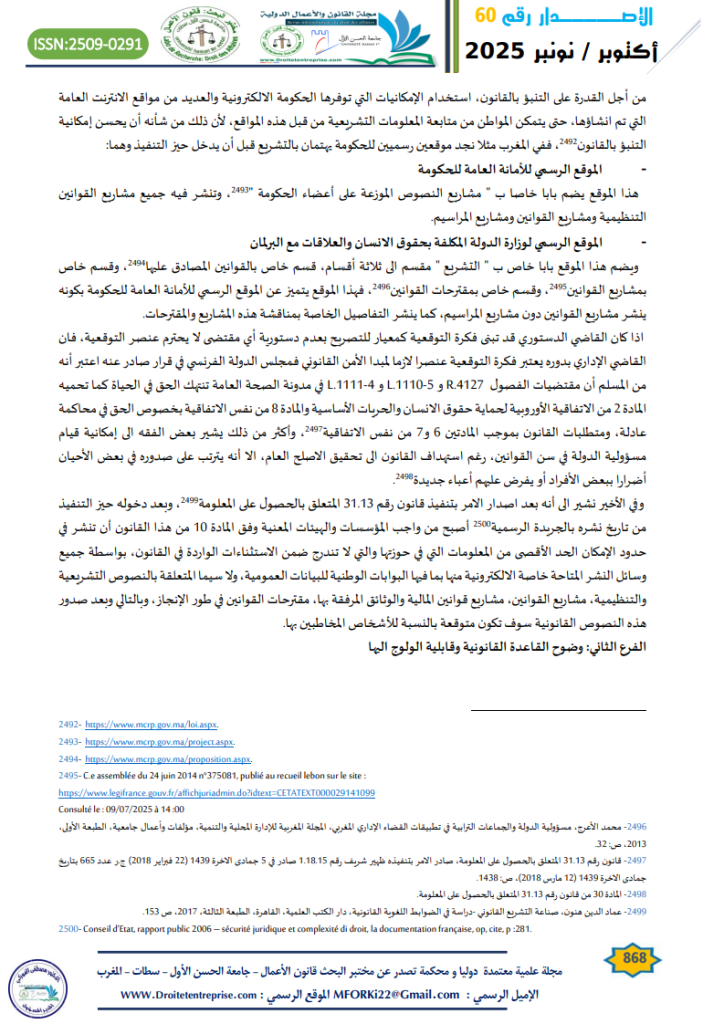 اذن مسالة الولوجية ترتبط بنشر النصوص القانونية في الجريدة الرسمية، وبما اْن هذه الجريدة تعد جريدة ورقية، فانه يصعب على الشخص المخاطب بهذا النص في بعض الاْحيان اْن يصل الى النسخ الورقية من هذه الجريدة الرسمية، الاْمر الذي اْدى بالدول الى خلق الية اْخرى تجعل النصوص القانونية متاحة للجميع وبطريقة سهلة، ويتعلق الاْمر ب”الجريدة الرسمية الالكترونية” اْو” الرقمية ” [68]، الا اْن هذه التقنية بدورها قد يصعب الولوج اليها من طرف الأشخاص غير الملمين بعلم الحاسوب والمعلوميات، فبالنسبة لفرنسا نجد الموقع الالكتروني الرسمي المخصص لنشر النصوص القانونية :www.legifrance.gouv.fr وبما اْن هذا الموقع يصعب على الشخص العادي تفحصه، فان الحكومة الفرنسية وضعت دليلا يشرح جميع الطرق التي يمكن من خلالها الولوج الى النصوص القانونية عبر هذا الموقع[69]، يكون الهدف منه هو المساعدة على الاستفادة بشكل اْفضل من موارد Légifrance خاصة تلك المتعلقة بالبحث عن المدونات والقوانين وفهم عملية الدمج[70]، اْما في المغرب فالموقع الذي يوفر للمواطن إمكانية الولوج المادي الى القواعد القانونية دون عناء فهو الموقع الرسمي للأمانة العامة للحكومة www.sgg.gov.ma والذي يهتم بصفة رسمية بنشر جميع النصوص القانونية في ” الجريدة الرسمية “، الا اْن هذا الموقع يصعب تفحصه من طرف العموم، لكنه يسهل مأمورية الرجوع الى جميع النصوص القانونية التي نشرت بالجريدة الرسمية من قبل الأشخاص المهتمين كالأساتذة الجامعيين والطلبة الباحثين …