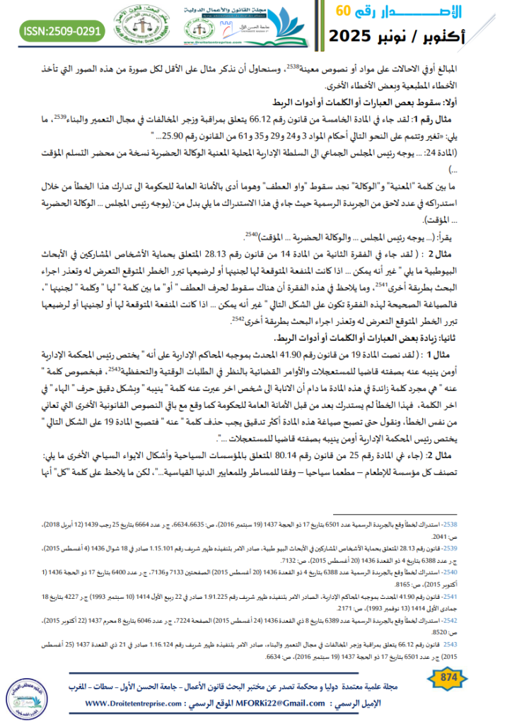 مثال 2 : ( لقد جاء في الفقرة الثانية من المادة 14 من قانون رقم 28.13 المتعلق بحماية الأشخاص المشاركين في الأبحاث البيوطبية ما يلي ” غير اْنه يمكن … اذا كانت المنفعة المتوقعة لها لجنينها اْو لرضيعها تبرر الخطر المتوقع التعرض له وتعذر اجراء البحث بطريقة اْخرى[78]، وما يلاحظ في هذه الفقرة اْن هناك سقوط لحرف العطف ” اْو” ما بين كلمة ” لها ” وكلمة ” لجنينها “، فالصياغة الصحيحة لهذه الفقرة تكون على الشكل التالي ” غير اْنه يمكن … اذا كانت المنفعة المتوقعة لها اْو لجنينها أو لرضيعها تبرر الخطر المتوقع التعرض له وتعذر اجراء البحث بطريقة اْخرى[79].