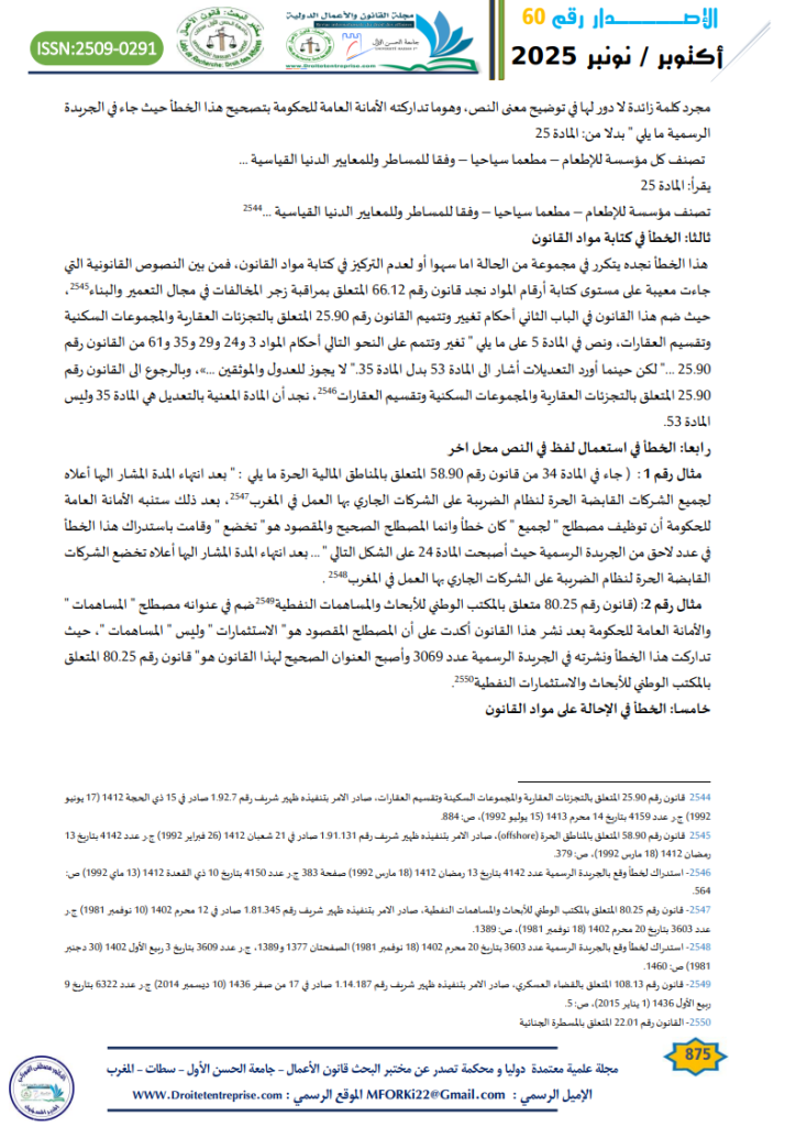 ما بين كلمة “المعنية” و”الوكالة” نجد سقوط “واو العطف” وهوما اْدى بالأمانة العامة للحكومة الى تدارك هذا الخطأ من خلال استدراكه في عدد لاحق من الجريدة الرسمية حيث جاء في هذا الاستدراك ما يلي بدل من: (يوجه رئيس المجلس … الوكالة الحضرية … المؤقت).