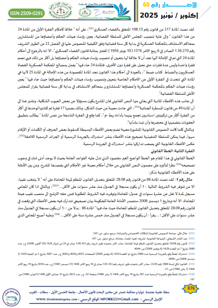 لقد نصت المادة 217 من قانون رقم 108.13 المتعلق بالقضاء العسكري[88]، على اْنه ” خلافا لأحكام الفقرة الاْولى من المادة 24 من هذا القانون ” والى غاية تنصيب المجلس الاْعلى للسلطة القضائية، يعين رؤساء هيئات الحكم واْعضاؤها من المستشارين بمحاكم الاستئناف بالمحكمة العسكرية في بداية كل سنة قضائية وفق الكيفية المنصوص عليها في الفصل 22 من الظهير الشريف رقم 1.56.270 الصادر في 6 ربيع الاخر 1376 ( 10 نونبر 1956 ) المعتبر بمثابة قانون القضاء العسكري”، الا انه بالرجوع الى اْحكام المادة 24 التي تم في الإحالة اليها نجد اْن لا علاقة لها بتعيين اْو تنصيب رؤساء هيئات الحكم واْعضاؤها بل اْكثر من ذلك فهي تضم فقرة واحدة وليس عدة فقرات حتى نحيل على فقرة دون الأخرى، فالمادة 24 جاء فيها ” يعمل بمصالح المحكمة العسكرية القضاة العسكريون والضباط كتاب ضبط “، بالعودة الى اْحكام هذا القانون نجد المادة المقصودة من هذه الإحالة هي المادة 25 لأنها هي المادة التي تتحدث في الفقرة الأولى عن الاحكام الخاصة بتعيين وتنصيب رؤساء هيئات الحكم واْعضاؤها حيث جاء فيها ” يعين رؤساء هيئات الحكم بالمحكمة العسكرية واْعضاؤها المستشارون بمحاكم الاستئناف في بداية كل سنة قضائية بقرار للمجلس الأعلى للسلطة القضائية”.