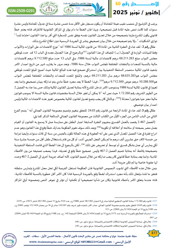 الخطأ القانوني في هذا المقام هو الخطأ الواضح الغير مقصود الذي تدل عليه القواعد العامة بحيث لا يوجد اْدنى شك في وجوب تصحيحه[91] نظرا لتأثيره على مضمون النص القانوني من خلال اْحكام معينة غير الاْحكام التي يقصدها المشرع، ومن بين الاْمثلة على هذه الاْخطاء القانونية نذكر: